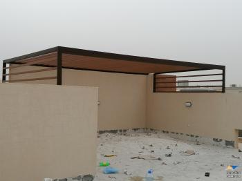 - تصاميم مظلات حديد يتم تأسيس المظلة بعمل بليتات على الأرض مع عمل السقف من الاعلى وعمل حديد قص بالليزر من الجوانب بشكل مميز.